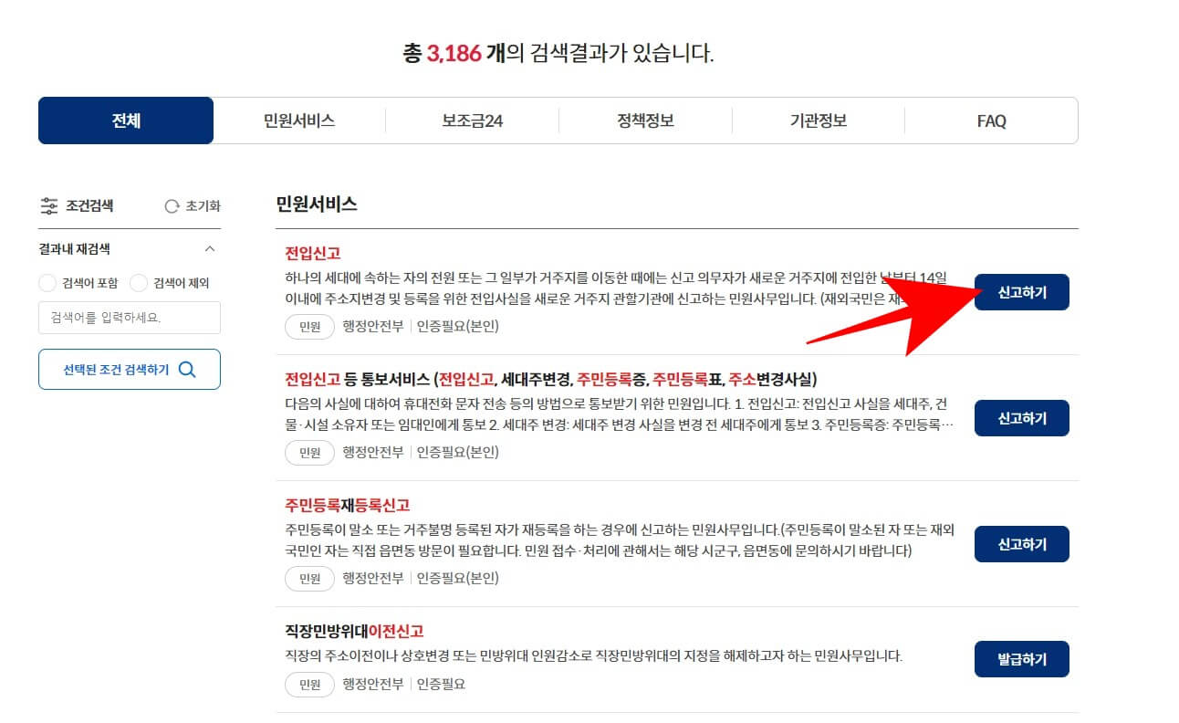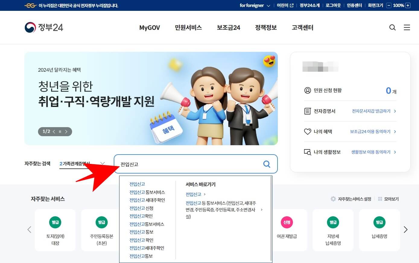1. 정부 24 홈페이지에서 로그인하신 후 검색에서 전입신고를 입력 >> 공인인증서 필요합니다.