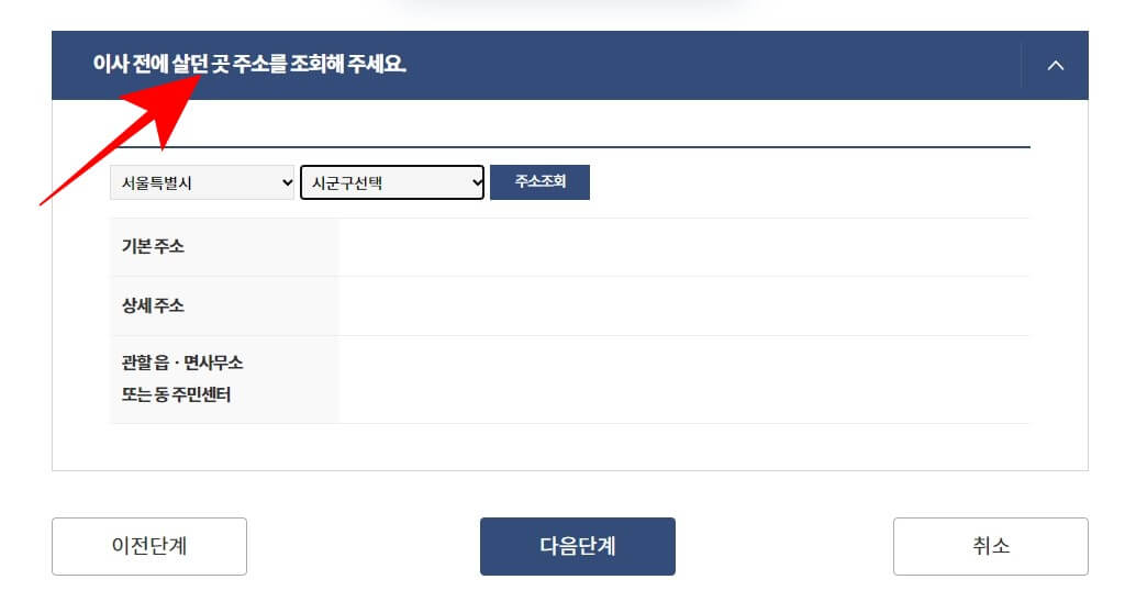5. 이사오기 전 살던 곳 주소를 조회합니다.