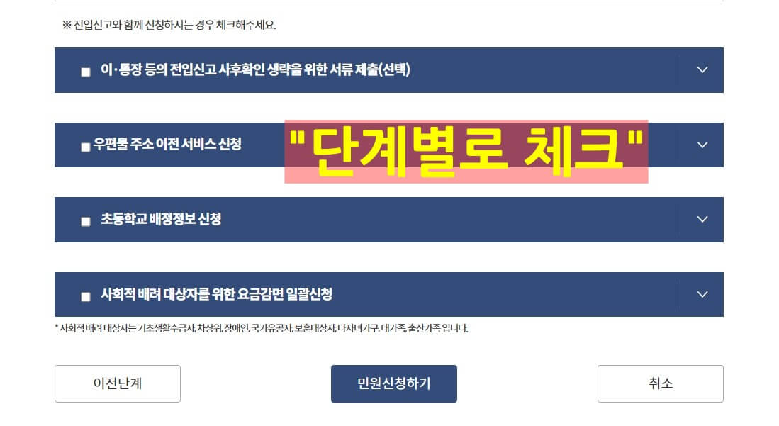 7. 단계별로 상황에 맞게 체크하고 민원신청하시기 바랍니다.